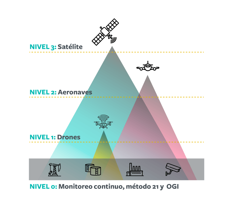En la figura que se muestra, se ilustra el alcance de las tecnologías para la detección de emisiones de metano, según el nivel correspondiente, la elección de la tecnología depende de la escala temporal y espacial en el siguiente orden: